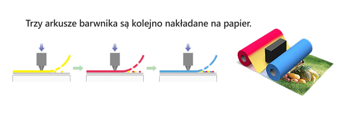 Głowica termiczna selektywnie podgrzewa cienki arkusz folii z stałym barwnikiem w formie barwnej folii, a odparowany barwnik przechodzi na papier. Nazwa termosublimacji pochopdzi od nazwy procesu jaki tu zachodzi - ciało stałe (barwnik) zamienia się w gaz. Jeden zestaw barwników zawiera trzy kolorowe arkusze, które są kolejno nakładane na papier.