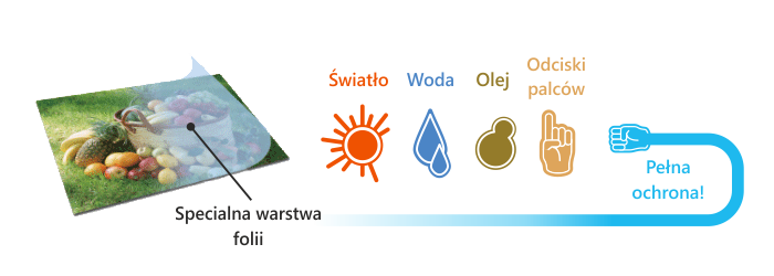 Dzięki pokryciu powierzchni specjalną warstwą folii, powierzchnia jest chroniona przed odciskami palców i wodą jednocześnie jest odporniejsza na działanie ozonu i światła niż inne metody.